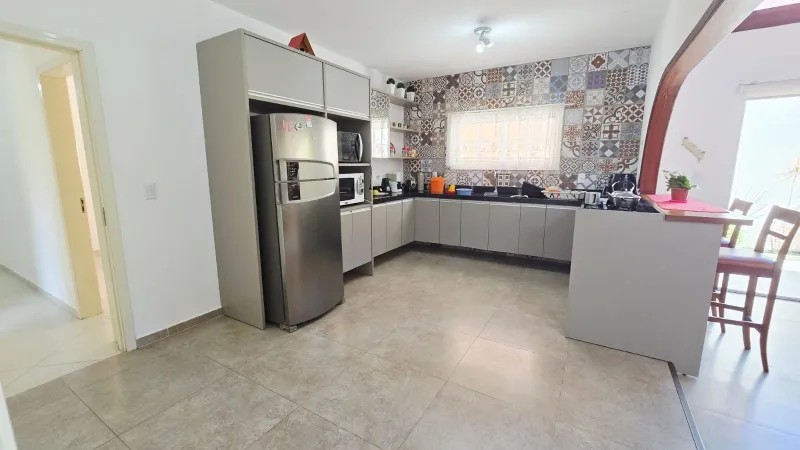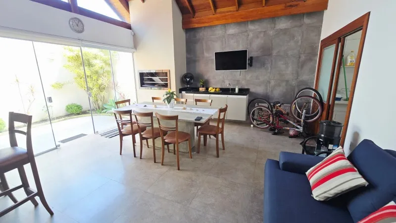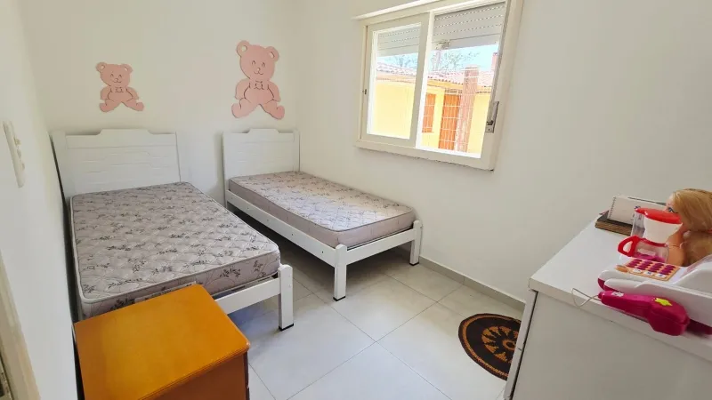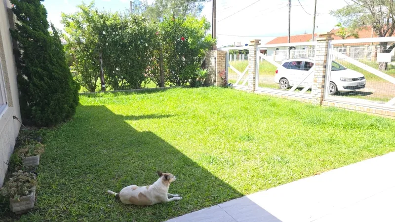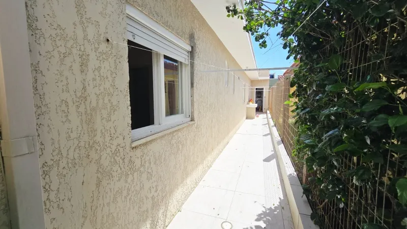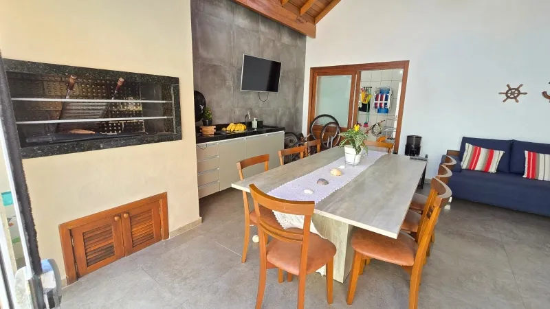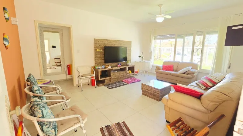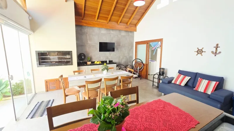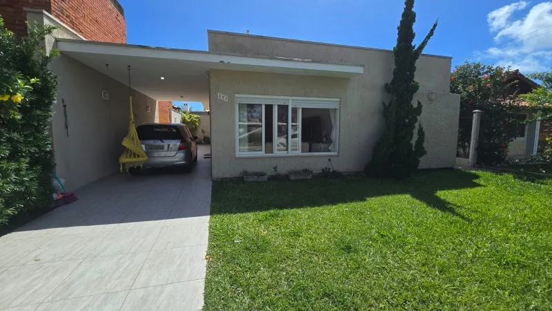 Casa térrea a 4 quadras do mar junto a plataforma, em alvenaria com 4 dormitórios (1 suíte), banheiro social, sala de estar, espaço de convivência com cozinha, sala de jantar, sala de jogos e área gourmet com churrasqueira, lavanderia, abrigo para carro, forro em laje, alarme monitorado, pátio gramado cercado com tela e portão com movimentador eletrônico, espaço para piscina, com móveis. A´rea construída de 165,00 m2 e Terreno de 12 x 25
