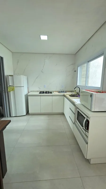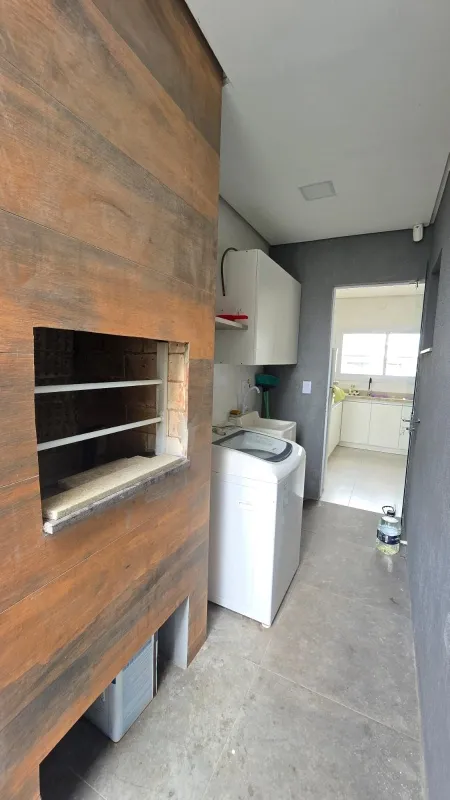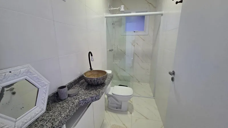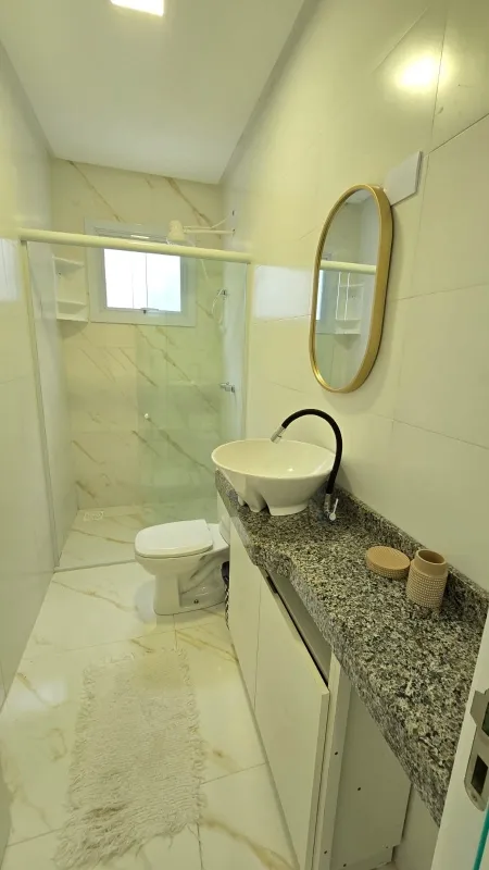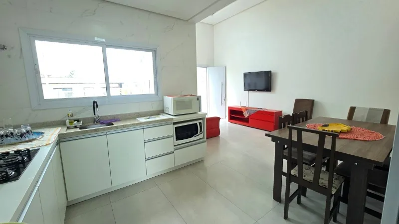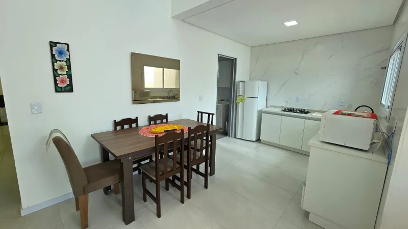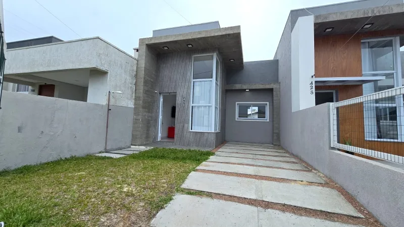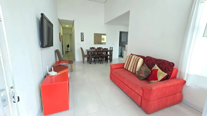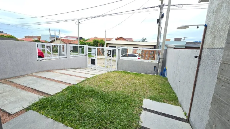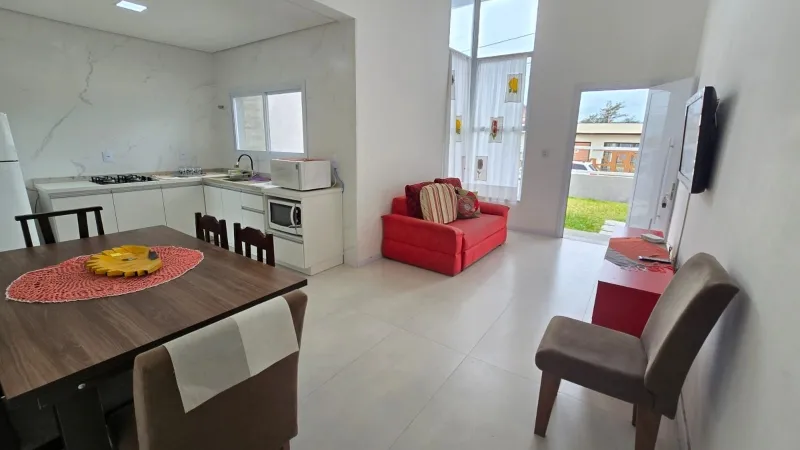 Casa nova geminada a 2 quadras do mar, são 2 dormitórios (1 suíte), banheiro social, ampla sala para 2 ambientes, cozinha integrada, área de serviço, churrasqueira, forro em laje de concreto, detalhes em gesso, semi mobiliado, pátio privativo no fundo, estacionamento para 2 carros, esquadrias em PVC, portão em alumínio frente sol da manhã, excelente ventilação.