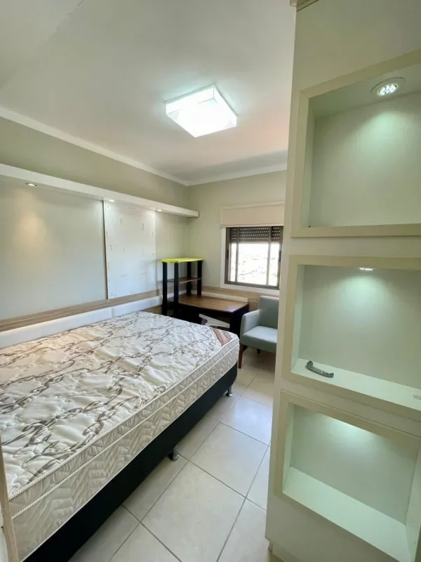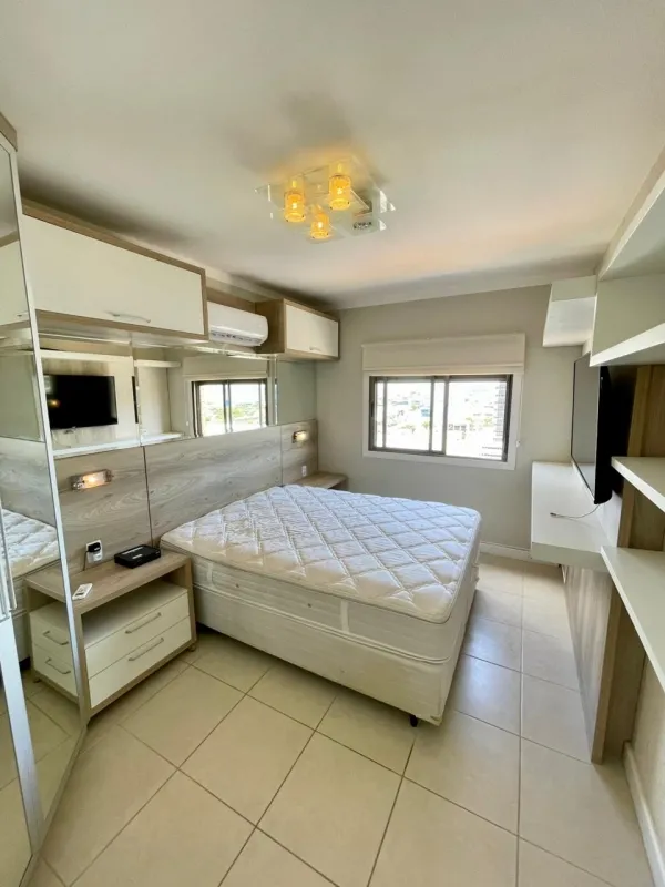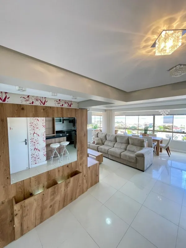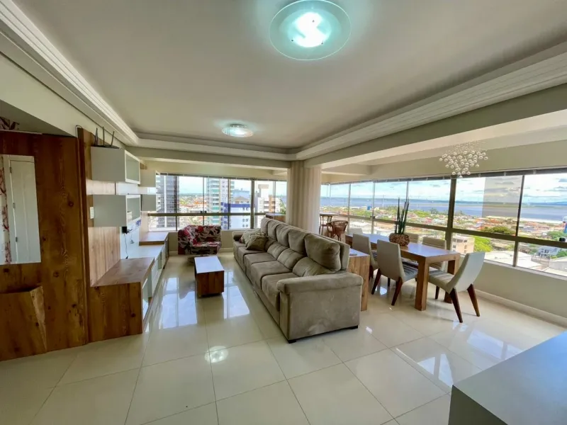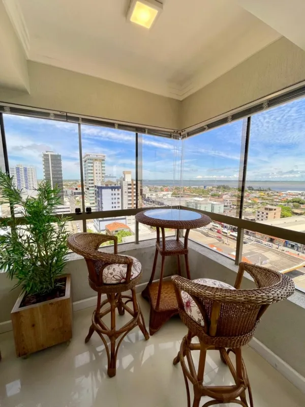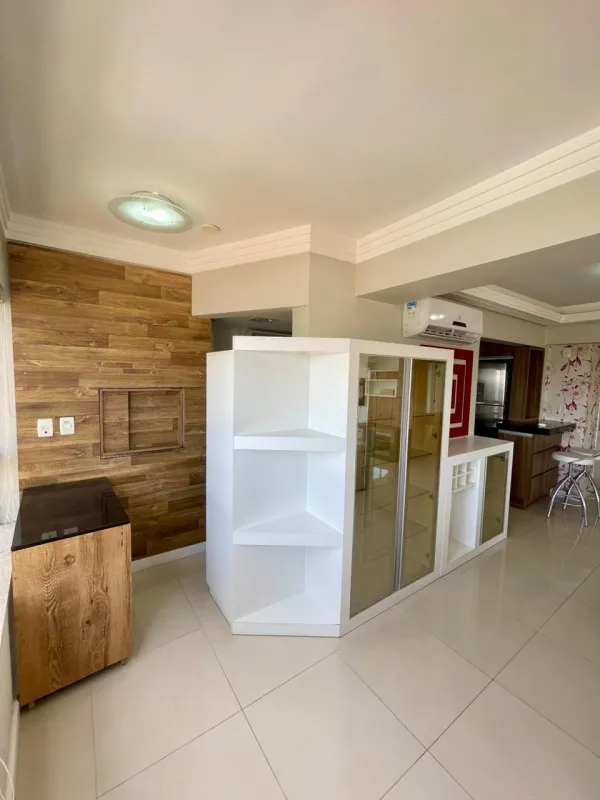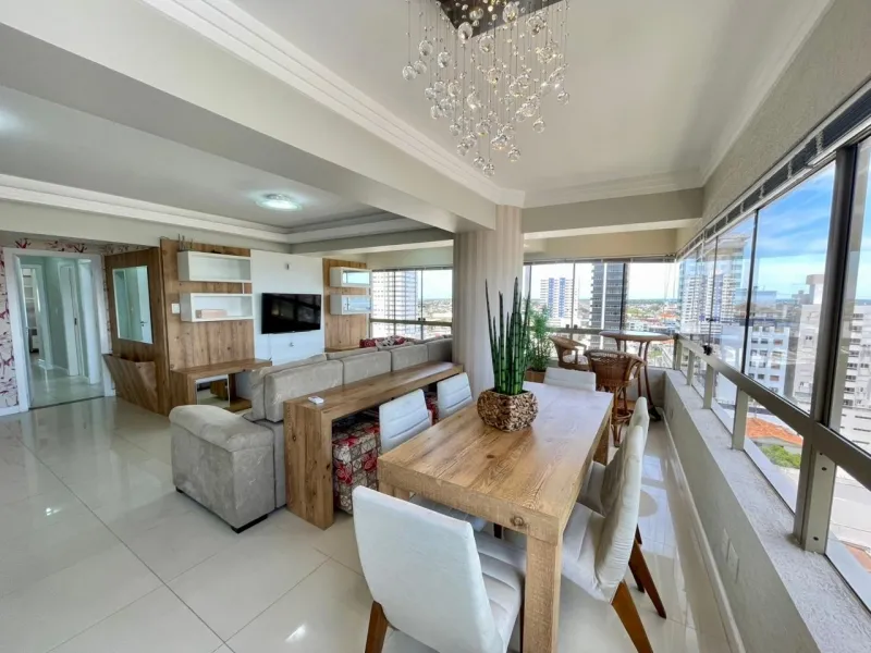 Apartamento amplo com 3 dormitórios (1 suíte), banheiro social, ampla sala com 2 ambientes, cozinha estilo americana, área de serviço, sacada com vista panorâmica, churrasqueira, mobiliado, ar condicionado, água quente, andar alto, estacionamento para 2 carros. Edifício com gás central, elevador, salão de festas . Central junto a todo comercio, bancos, restaurantes, farmácia e escola.